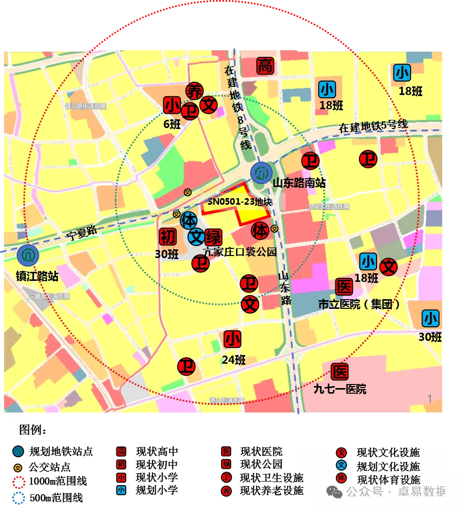 2.教育与医疗:现状周边教育有超银中学、镇江路小学、超银小学等,医疗卫生有市立医院(集团)徐州路院区、九七一医院、社区卫生服务站等;规划周边有3所小学。