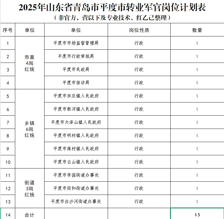 2025年平度市为转业军官提供了13个安置岗位,100%为行政编制。