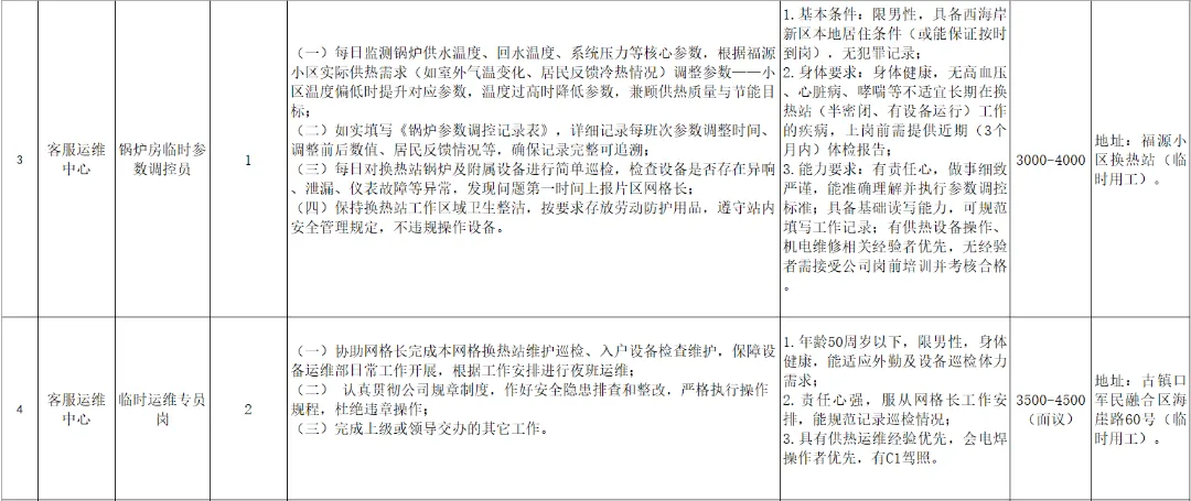 考察、体检合格人员名单在青岛人事人才网(www.qdrsrc.cn)公示3个工作日。其中岗位1、岗位3、岗位4为临时用工,用工期于明年4月份供热期完结束,岗位2为长期用工人员,试用期内薪酬待遇由用人单位参考现有同等岗位待遇确定,试用期满后,由用人单位根据考核情况确定是否录用。