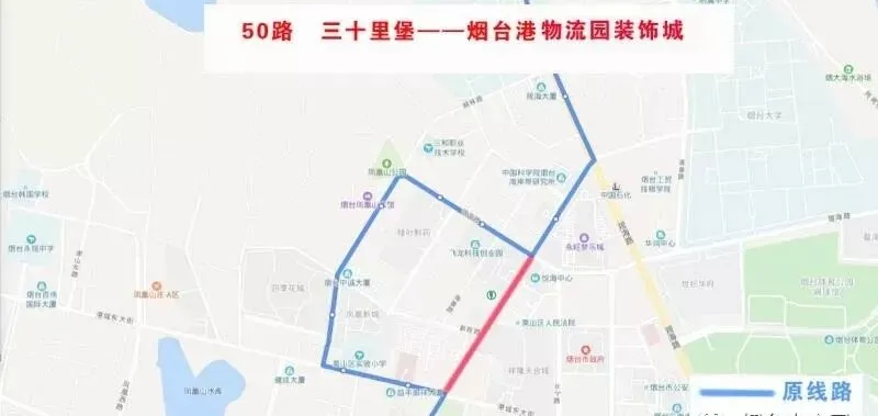 9月17日(下周一)50路双向调整如下:从三十里堡发车,沿原路线运行至迎春大街与港城东大街交叉口直行,沿迎春大街恢复原路线。临时取消:毓璜顶医院莱山分院、初家街道办事处、桐林路南口、桐林路、烟台国际、银海路共6个站点。