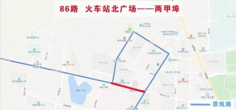 9月17日(星期一)86路双向调整如下:从曲家庄发车,沿原路线运行至迎春大街与港城东大街交叉口左转,沿港城东大街行至与桐林路交叉口直行恢复原路线。临时取消:凤凰小区、中国农业银行莱山支行、银海路、烟台国际、桐林路、桐林路南口共6个站点。