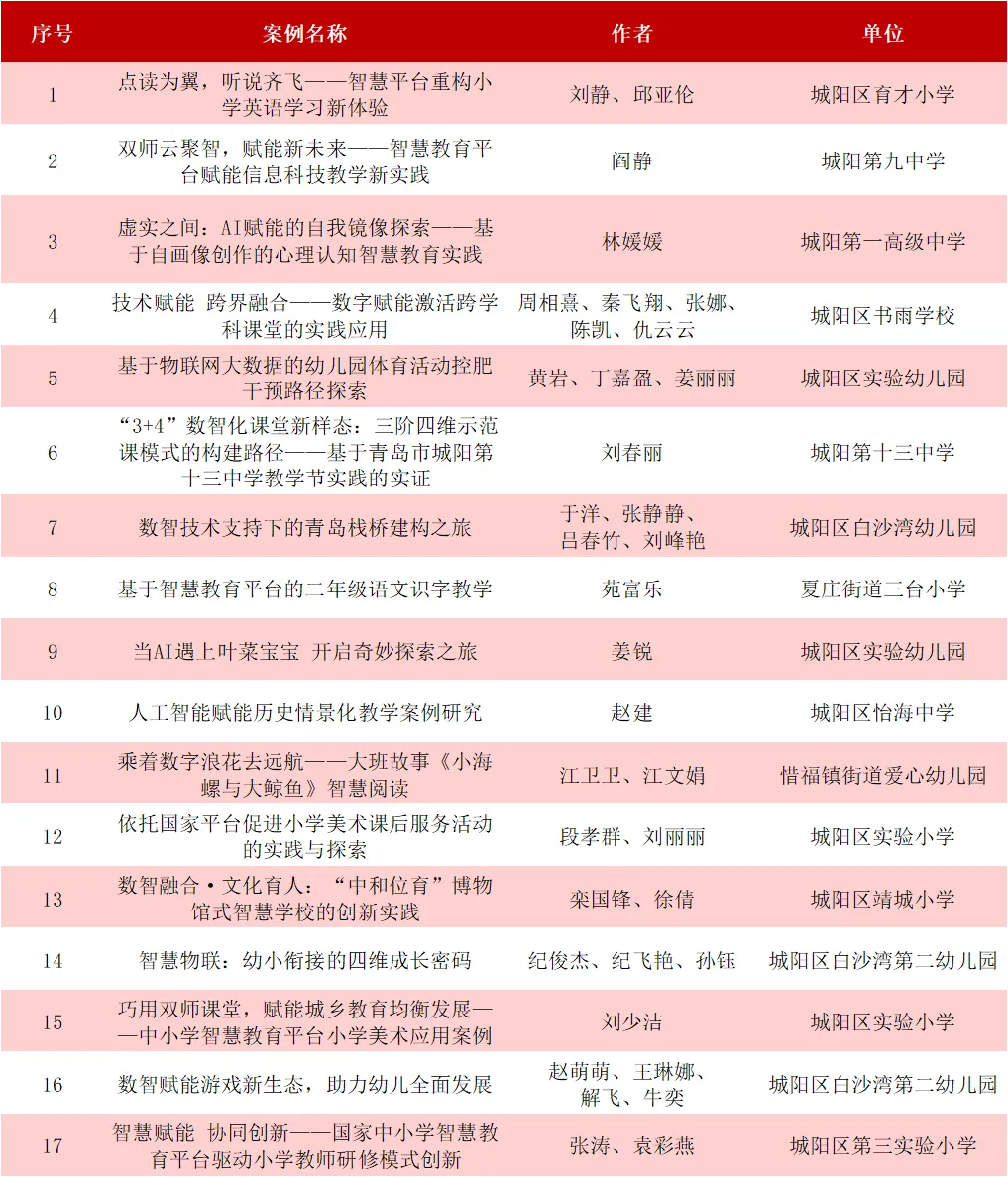 近日,青岛市教育局公布“2025年青岛市智慧校园典型应用场景和智慧教育优秀案例”获奖名单。本次全市共遴选出100个优秀案例和100个典型应用场景。其中,城阳区17个案例获评青岛市智慧教育优秀案例,获奖数量位居全市第二,较24年实现两倍增长;21个应用场景获评青岛市智慧教育典型应用场景,获奖数量位居全市第一。