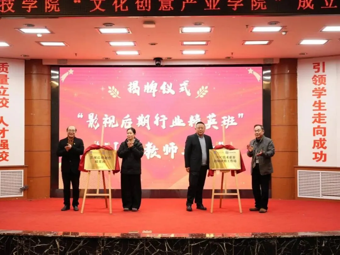 在与会嘉宾的共同见证下,现场举行了多项揭牌与合作仪式。左振华副校长与山东万享视界传媒有限公司副总经理侯露英共同为“影视后期行业精英班”揭牌;副校长郭迎昌与山东金铭桐林教育科技有限公司总经理程宪伟为“AIGC教师工坊”揭牌。随后,学校领导与企业代表共同为“文化创意产业学院”正式揭牌,标志着校企合作进入实体化运作新阶段。