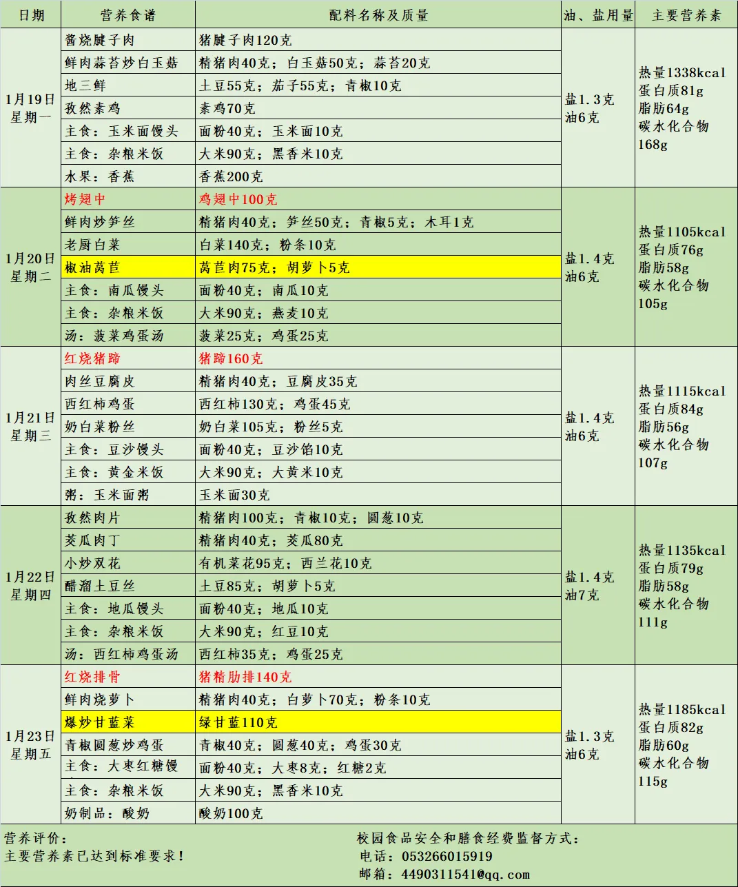 注: 以上菜品会根据原料组织情况或其它不可预见因素可能会做调整,敬请谅解!标注黄色部分为“三减”菜品。祝各位师生用餐愉快!