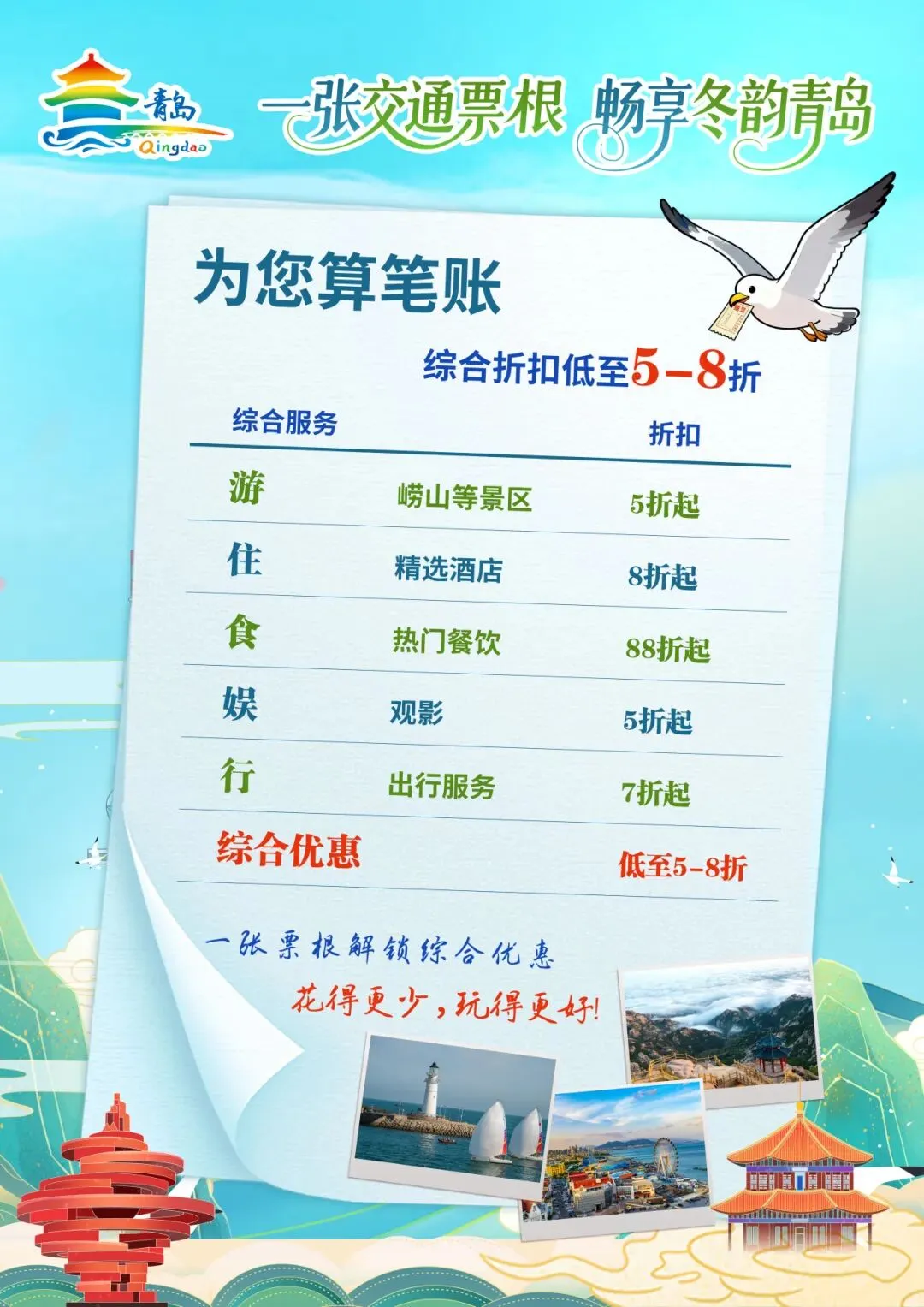 在新浪微博、小红书平台带活动话题#一张票根畅游青岛+晒出青岛景点门票、交通票根(火车、飞机、轮渡等),搭配游玩照片或短视频,分享你的愉快旅程(如景点体验、打卡攻略、小众玩法等)。