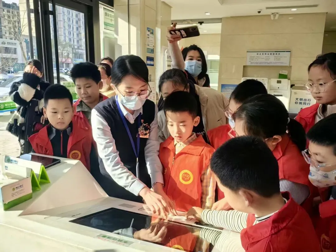 课堂之外,烟台银行联合牟平区萤火虫爱心志愿服务队,邀请小学生代表走进营业网点,开启沉浸式“小小银行家”职业体验之旅。孩子们先后探访了现金业务区、非现金业务区、自助设备区等核心区域,全面了解银行网点的功能布局、服务流程与日常运营逻辑。