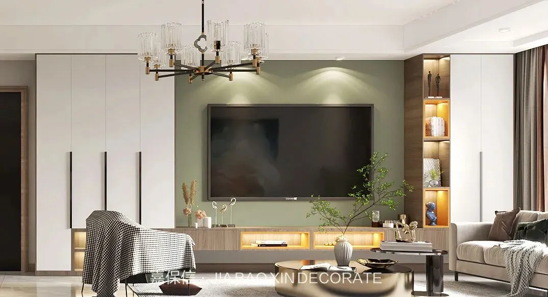 客厅以白色打底,配上绿色电视墙,金色与木色穿插点缀,整个空间清新又温馨。电视墙两侧是通顶白色储物柜,中间是悬空的木色电视柜,让主人的个人收藏上墙成为艺术品,日常杂物则被藏纳于无形。水晶吊灯与筒灯光影交织,衬出现代风格之家的精致层次。
