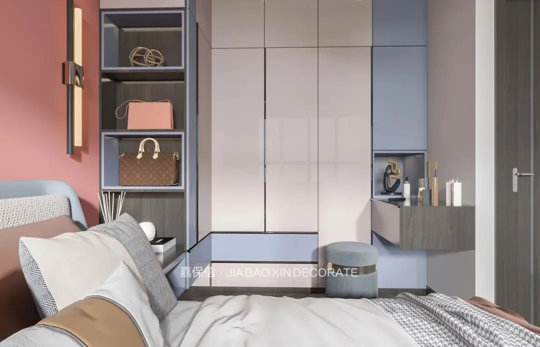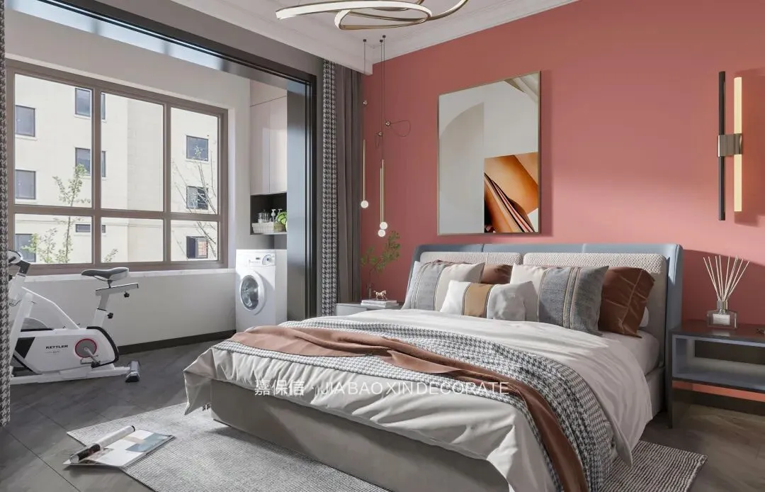 来到卧室,珊瑚粉床头墙衬着抽象装饰画,时尚中透着温馨。吊灯、壁灯与筒灯交织出柔和光影,丰富了空间层次。