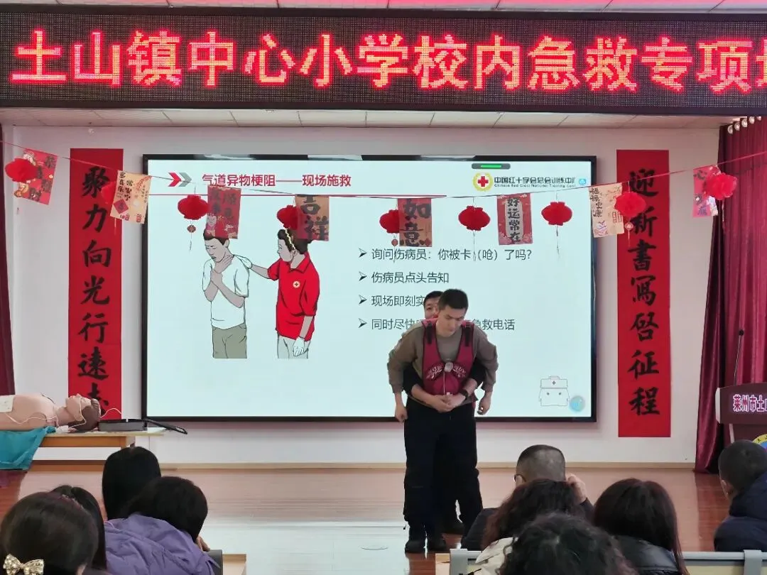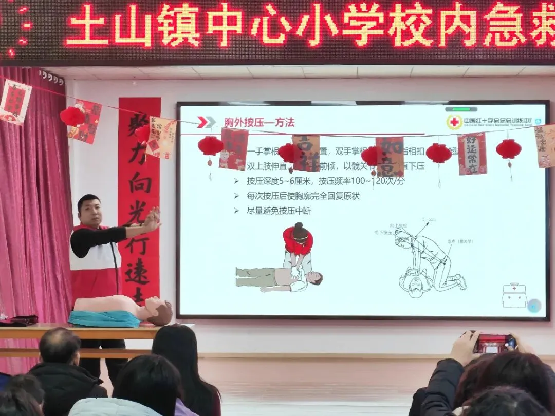 培训现场,莱州市红十字会救护讲师、红十字莱州云峰救援队副队长李岳向师生普及红十字运动基本知识,详细解读红十字会“三救三献”核心职能,并结合应对校园常见意外伤害与突发状况的实际需求,重点讲解心肺复苏(CPR)操作流程、自动体外除颤器(AED)使用方法、气道异物梗阻施救技巧,着重强调“黄金四分钟”紧急救援的重要性,帮助参训师生直观掌握核心急救技能。