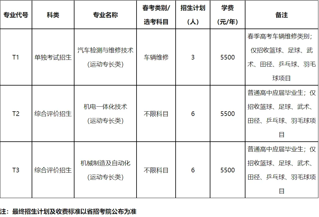 运动专长类招生分专业计划表
