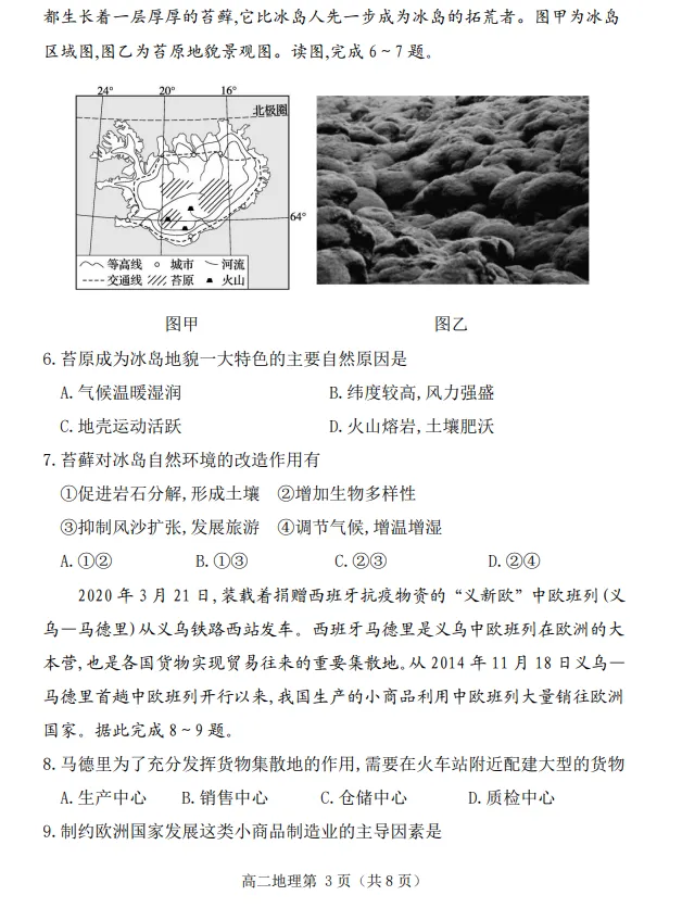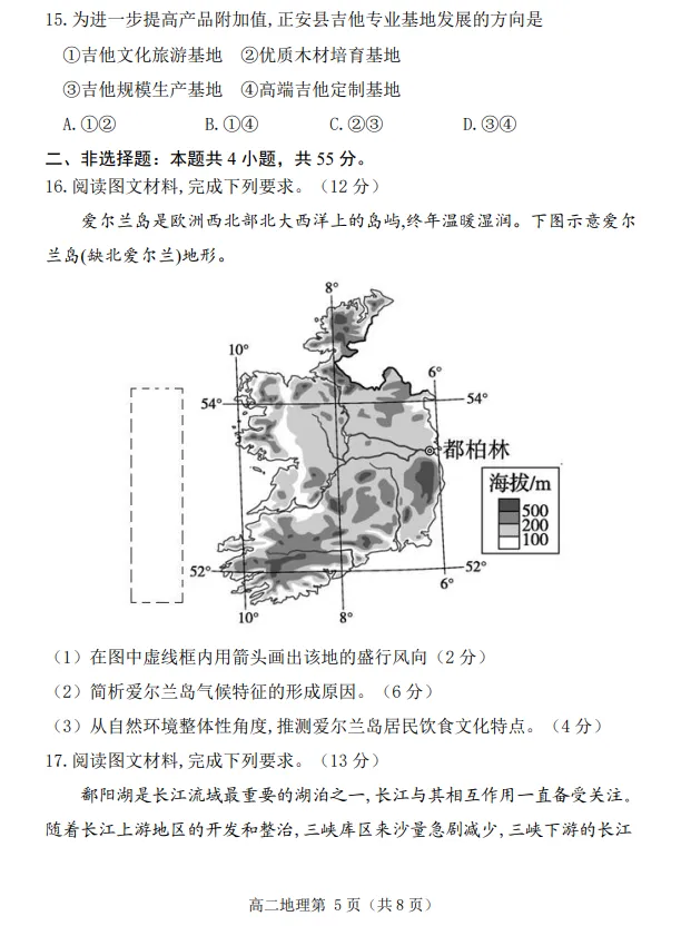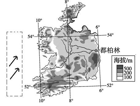 (2)爱尔兰岛西临大西洋,终年受西风带控制,全年温和湿润;地势南北高,中间低,中部平原面积较广,(或整体海拔不高),易于暖湿空气深入内陆;北大西洋暖流沿该岛西海岸北上,对岛屿气候起到增温增湿的作用。(6分)