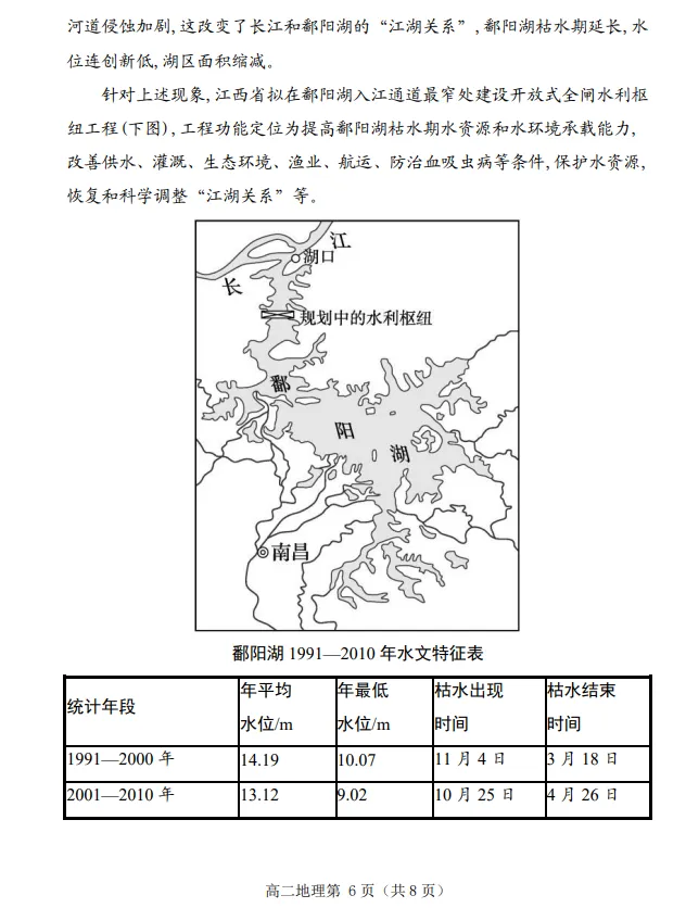 (1)三峡下游泥沙淤积作用减弱,河流对河床的侵蚀作用加剧;长江水位下降,低于鄱阳湖水位的时间变长;长江补给鄱阳湖的时间缩短,导致鄱阳湖枯水期延长。(6分)