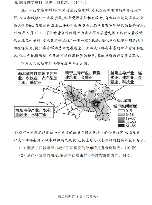 原因:西部人口稀少,经济发展水平较低;兰州、西宁为省级行政中心,城市等级高,辐射带动能力强;兰州经济发展水平更高,人才技术优势更大,辐射带动作用更强。(6分)