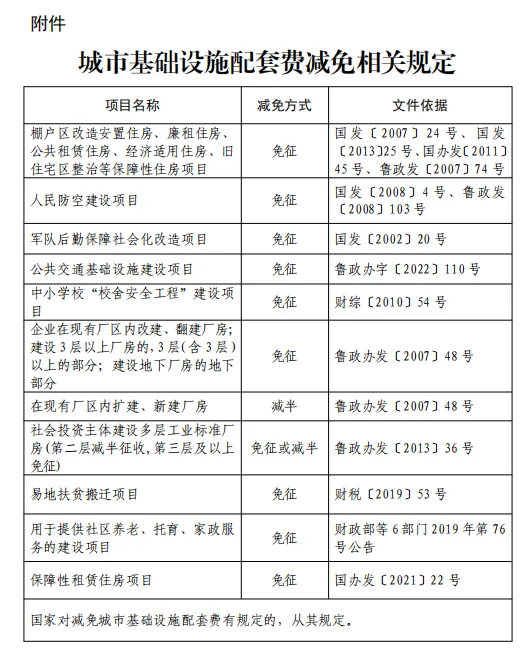 对于符合国家、省有关城市基础设施配套费减免规定的,应当向征收部门提出申请,由征收部门按照相关规定办理,具体减免政策详见附件。