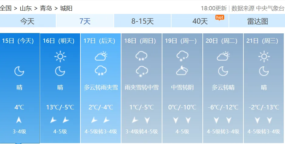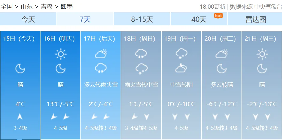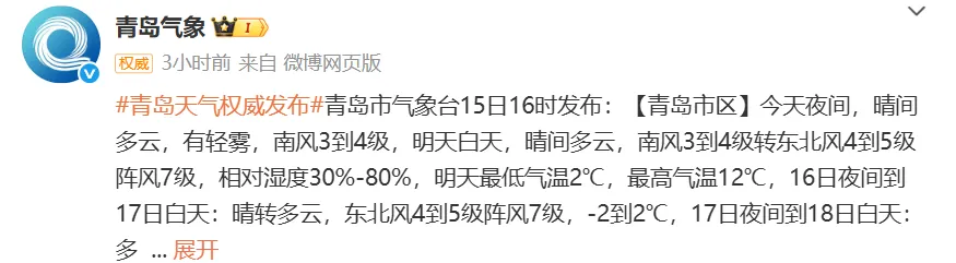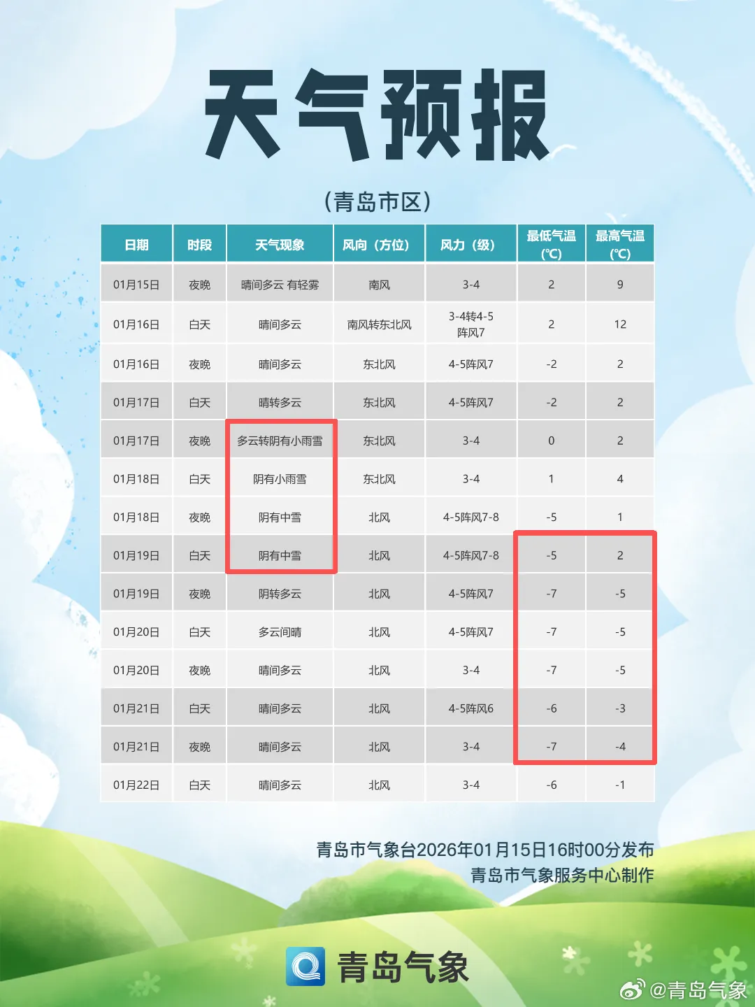16日白天,我市持续晴朗天气,全市最高气温在10~14℃。随着新一轮冷空气的到来,下午风向转为北风后,风力增大。17日,我市转为多云天,北风持续偏大,冷空气带来的降温威力显现,各区市的最高气温会迅速回落到2℃左右。而到了周日,我市天气更为复杂,将会出现雨雪过程。预计即将影响我市的冷空气,影响时间长,并伴有雨雪、大风和持续多日的低温,请多留意天气变化,做好相应的防范措施。【青岛市区】16日白天,晴间多云,南风3到4级转东北风4到5级阵风7级,相对湿度30%~80%,16日最低气温2℃,最高气温12℃。16日夜间到17日白天:晴转多云,东北风4到5级阵风7级,-2到2℃。17日夜间到18日白天:多云转阴有小雨雪转小到中雪,东北风3到4级,0到4℃。【预报各区】15日夜间到16日白天,晴间多云,有轻雾,南风转东北风,海上,5到6级转7到8级阵风9级,内陆,3到4级转4到5级阵风7级,16日最低气温-2℃,最高气温14℃。16日夜间到17日白天:晴转多云,东北风4到5级阵风7级。17日夜间到18日白天:多云转阴南部地区有小雨雪,北部地区有小雨雪转小到中雪,东北风3到4级。●来源:半岛都市报(bandaobao)综合中国天气网、@青岛气象等●责任编辑:王辰