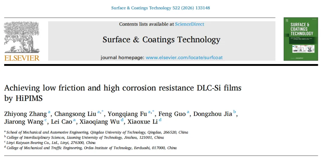 青岛理工大学《Surf. & Coat. Technol.》| HiPIMS制备的低摩擦高耐腐蚀DLC-Si薄膜