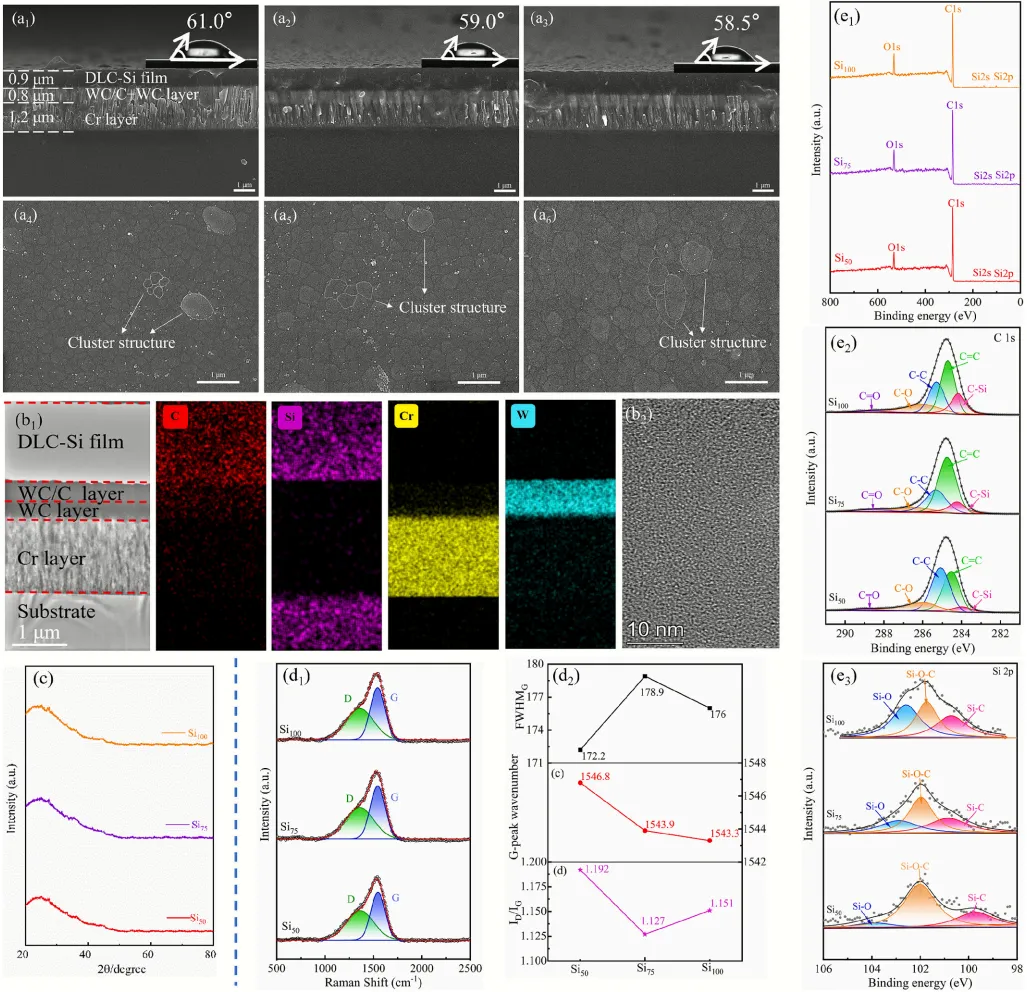 图2. DLC-Si薄膜的截面和表面SEM形貌及其接触角:(a1, a4)Si50;(a2, a5)Si75;(a3, a6)Si100;(b):Si75薄膜的TEM截面结构、其截面EDS元素分布图及其HRTEM谱图;(c):DLC-Si薄膜的XRD结果;(d):DLC-Si薄膜的拉曼光谱结果:(d1)拉曼光谱;(d2)半高宽大小、G峰位置、ID/IG比值;(e):DLC-Si薄膜的XPS结果:(e1)XPS全谱;(e2)C 1s窄谱;(e3)Si 2p窄谱。