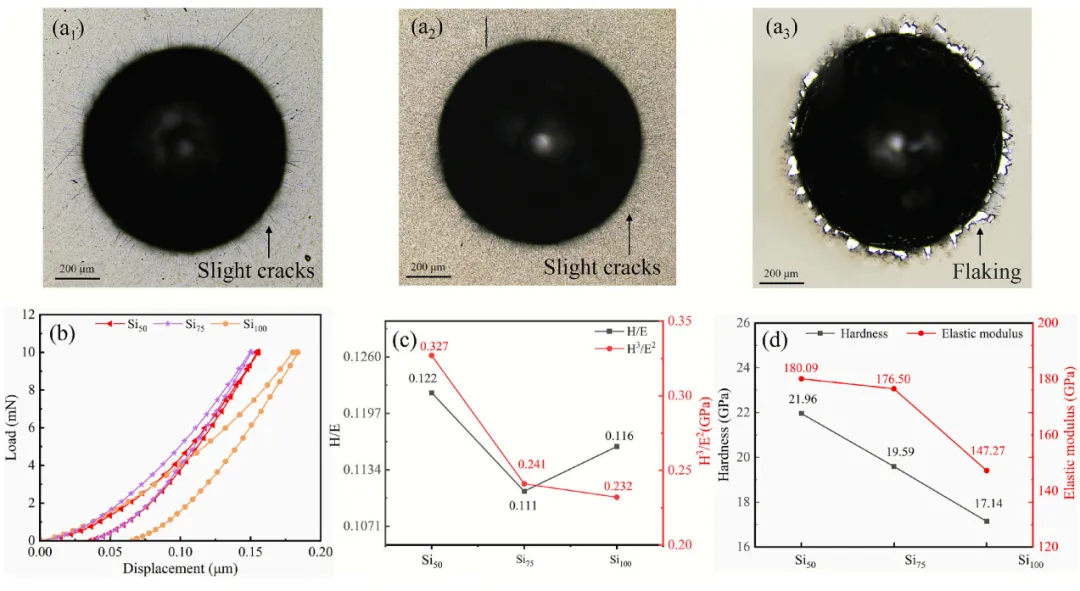 图3. 硅含量对DLC-Si薄膜力学性能的影响:(a)三种DLC-Si薄膜的压痕光学图像(a1)Si50, (a2)Si75, (a3)Si100;(b)载荷-压痕深度变化曲线;(c)硬度和弹性模量;(d)H/E和H³/E²值。