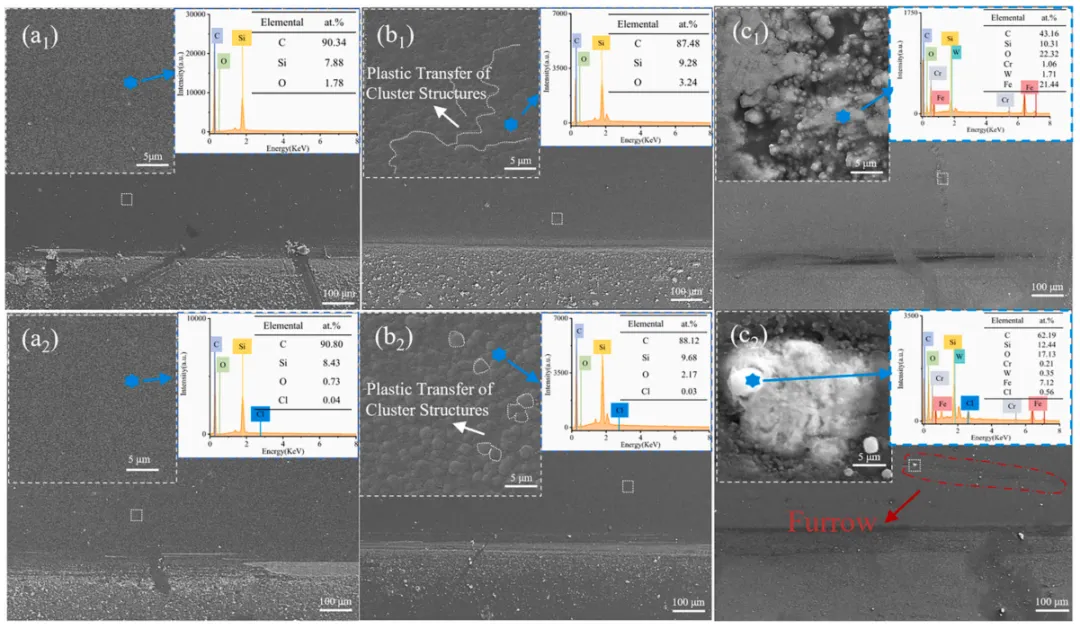 图5. 不同样品在不同环境中摩擦磨损测试后的磨痕SEM图像及其EDS结果(a,b,c):Si50, Si75, Si100;(abc(1,2)):空气环境下的磨痕形貌及EDS结果;(abc(3,4)):人工海水环境下的磨痕形貌及EDS结果。