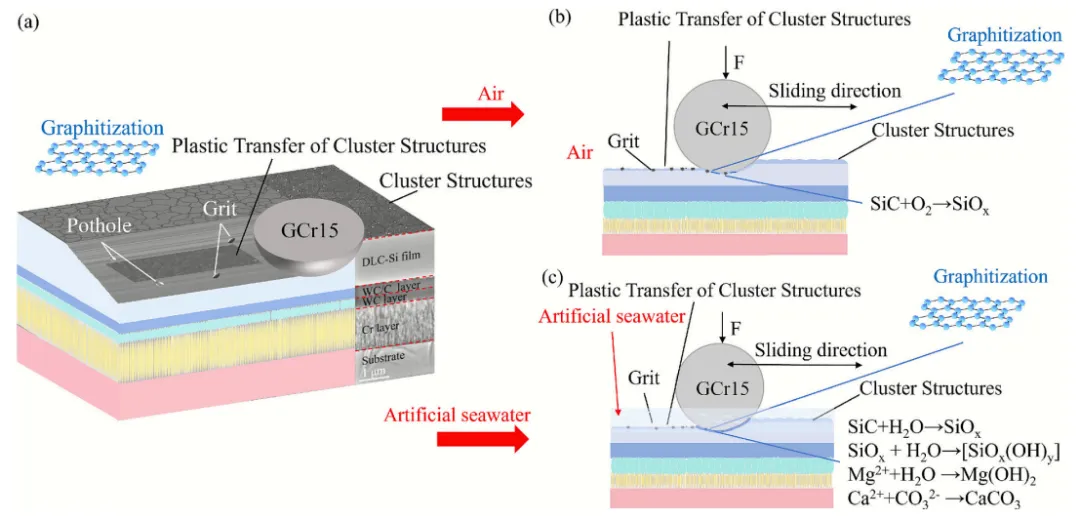 图6. 在空气(b)和人工海水(c)环境下的摩擦磨损机制示意图。