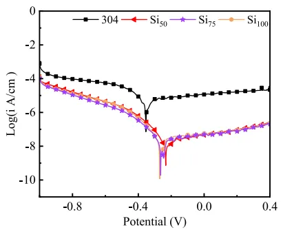 DLC-Si薄膜的致密结构和硅掺杂形成的SiOx钝化膜有效阻隔了离子渗透。Si75薄膜具有最低腐蚀电流密度(3.397×10⁻⁸ A/cm²)和最高电荷转移电阻(4.401×10⁶ Ω·cm²),其耐腐蚀性比304不锈钢提高三个数量级。