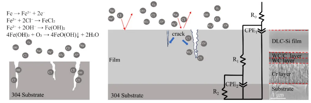 图9. 304基底和DLC-Si薄膜的腐蚀机制示意图。