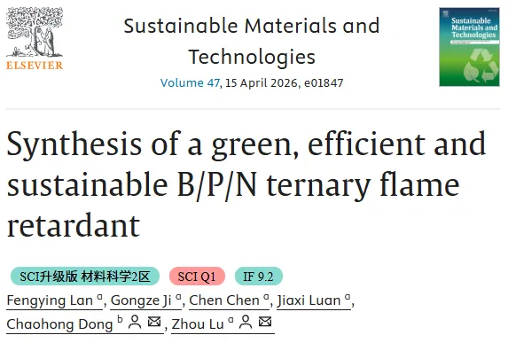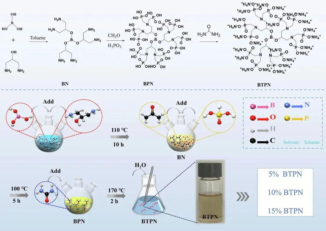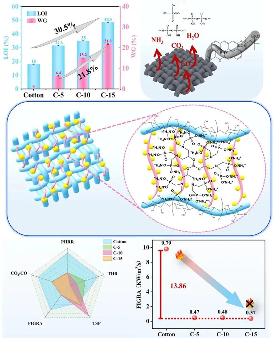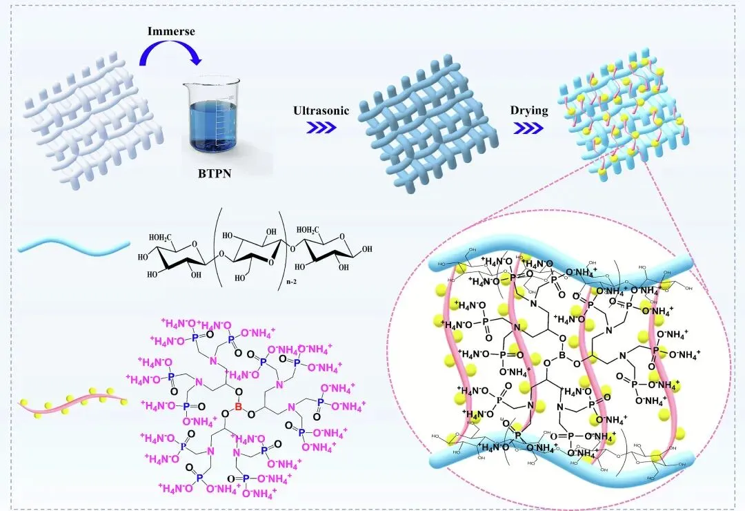 针对棉织物阻燃性能不足及绿色化改性需求,青岛大学的研究团队构建了一种无卤B/P/N三元协同阻燃体系,设计并合成了绿色、高效且可持续的阻燃剂BTPN,并通过化学接枝方式稳定引入棉纤维结构中。实验结果表明,在较高耐洗性的前提下,BTPN显著提升了棉织物的极限氧指数,且在多次水洗后仍保持优异阻燃性能;锥形量热测试显示,材料的峰值热释放速率和总热释放量大幅降低,燃烧蔓延得到有效抑制。热重分析与形貌表征进一步证实,BTPN在燃烧过程中可催化纤维快速脱水成炭,形成致密稳定的保护炭层,其中P–O–P、B–O–B等结构在凝聚相中发挥关键作用;同时,气相与凝聚相阻燃机制协同作用,共同提升了材料的整体防火安全性。相关成果以 Synthesis of a green, efficient and sustainable B/P/N ternary flame retardant 为题,发表在期刊 Sustainable Materials and Technologies 上,为棉织物阻燃改性的绿色化、可持续分子设计提供了重要参考。