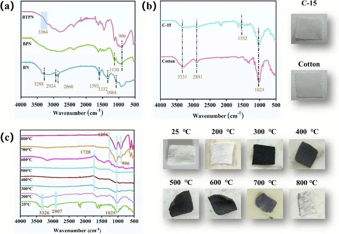 图3、各步骤产物的 FT-IR 光谱 (a);棉花和 C-15 的 FT-IR 光谱 (b);C-15 在不同温度下的 FT-IR 光谱和物理图 (c)