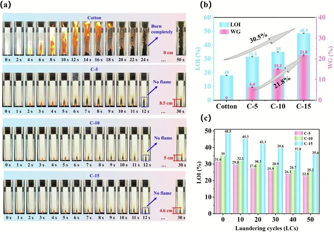 图4、 Cotton、C-5、C-10 和 C-15 的 VFT 实时图像;LOI 和 WG 数据 (b);不同 LC 后 LOI 的变化趋势 (c)