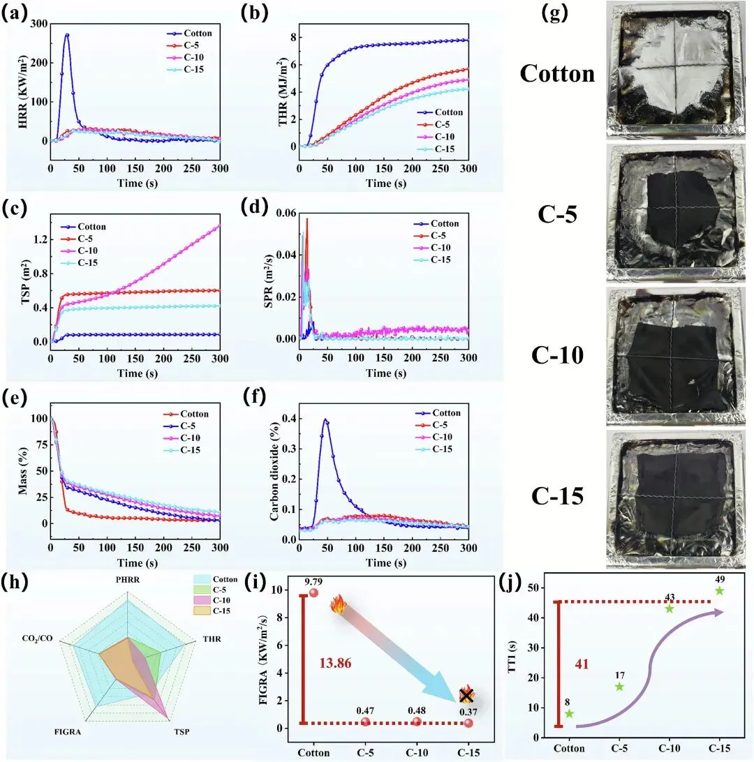 图5、 样品的 HRR (a)、THR (b)、TSP (c)、SPR (d)、质量 (e) 和二氧化碳 (f) 曲线;棉、C-5、C-10 和 C-15 在锥形物中的炭残留量 (g);样品的综合性能 (h)、FIGAR (i) 和 TTI (j) 曲线