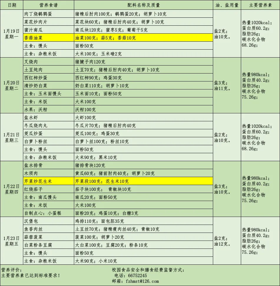 各位家长:为了让您全面了解学生在校的用餐情况,我校学生“营养食谱”特通过官方微信提前发布。学校每周“营养带量食谱”确保膳食安全、营养、均衡、充足,满足孩子健康成长需要,敬请家长关注。食谱所公示菜品原则上不做改动,若因市场原料或其他不可预见因素变化,将会根据实际情况做出最优调整,敬请谅解。标注黄色部分为“三减”菜品,祝大家用餐愉快!