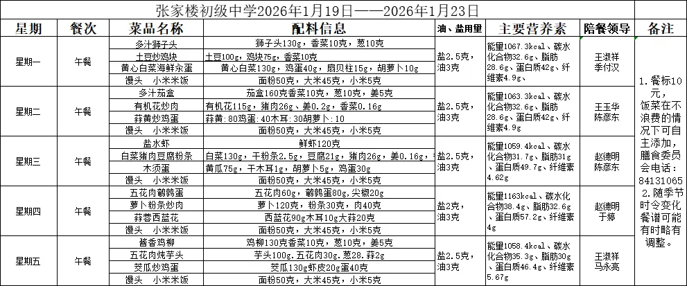【仁和●动态-全环境立德树人】青岛西海岸新区张家楼初级中学餐厅1.19—1.23膳食菜谱计划