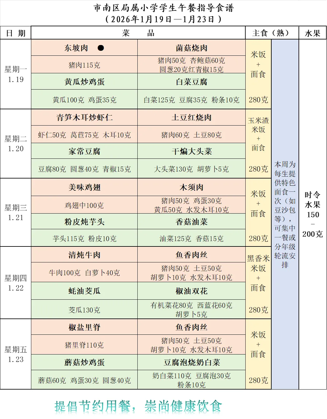 青岛定陶路小学学生午餐食谱(1月19日—1月23日)