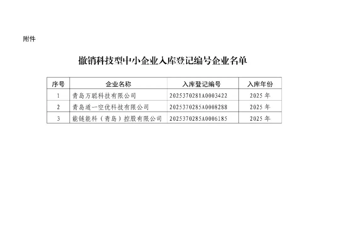 根据《科技型中小企业评价办法》(国科发政〔2017〕115号)和《科技型中小企业评价服务工作指引》(国科火字〔2022〕67号)有关规定,经核查,青岛万聪科技有限公司等3家企业不符合科技型中小企业评价入库条件,现撤销其2025年科技型中小企业入库登记编号。具体名单详见附件。