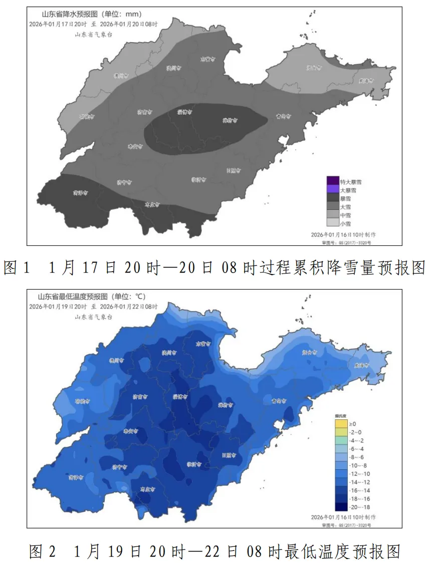 暴雪蓝色预警和道路结冰橙色预警:17日夜间至19日夜间,我省将出现大范围雨雪天气,过程累积平均降水量8~15毫米。其中,17日夜间,鲁西北、鲁中和半岛地区有小雪或雨夹雪,鲁南地区有小雨;18日白天到19日夜间,济南、泰安、淄博和潍坊有大雪到暴雪,菏泽、济宁、枣庄、临沂和日照有小雨或雨夹雪转大雪局部暴雪,聊城、德州、滨州、东营、烟台、威海和青岛有中到大雪,鲁中山区局部有冻雨。积雪深度3~8厘米,最大可达12厘米以上,将出现对交通有较大影响的道路结冰。