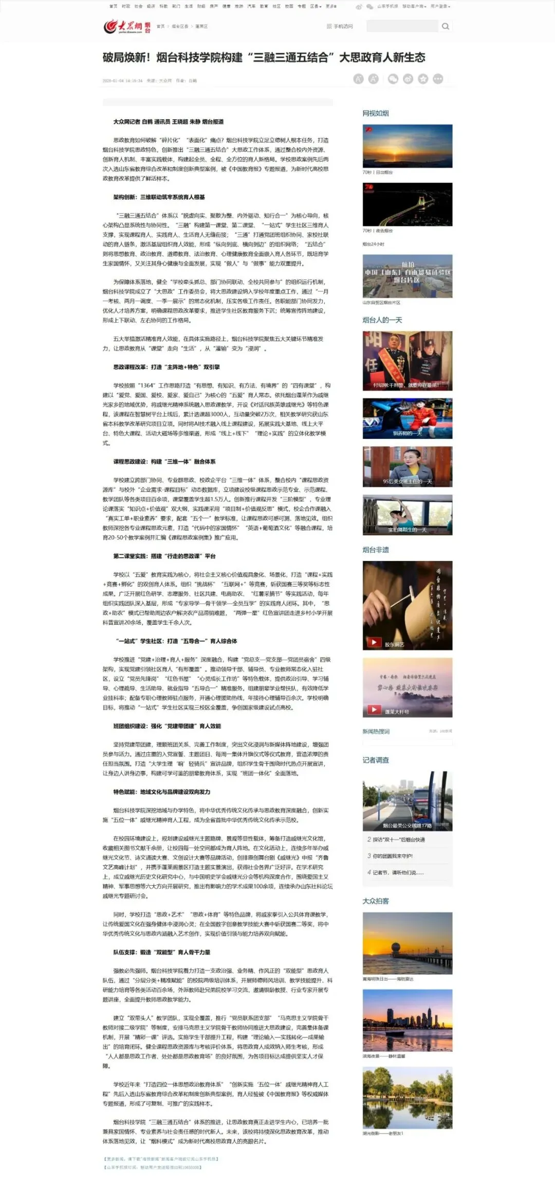思政教育如何破解“碎片化”“表面化”痛点?烟台科技学院立足立德树人根本任务,打造烟台科技学院思政特色,创新推出“三融三通五结合”大思政工作体系,通过整合校内外资源、创新育人机制、丰富实践载体,构建起全员、全程、全方位的育人新格局。学校思政案例先后两次入选山东省教育综合改革和制度创新典型案例,被《中国教育报》专题报道,为新时代高校思政教育改革提供了鲜活样本。