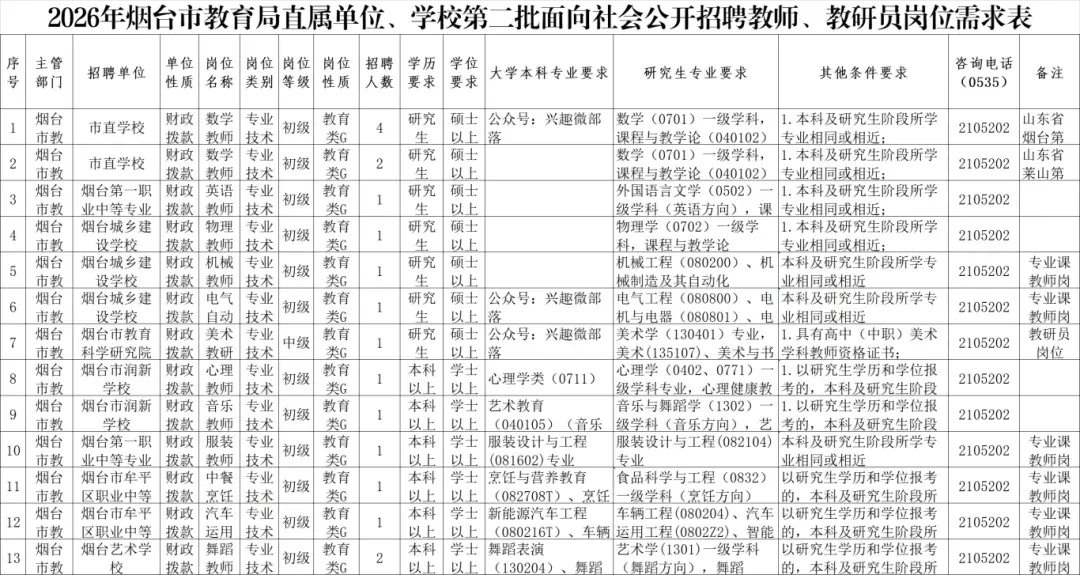 2026年烟台市教育局直属单位、学校第二批面向社会公开招聘教师、教研员公告(18人)