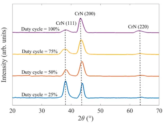 图1. 衬底偏压占空比为100%、75%、50%和25%时CrN涂层的GIXRD图谱。