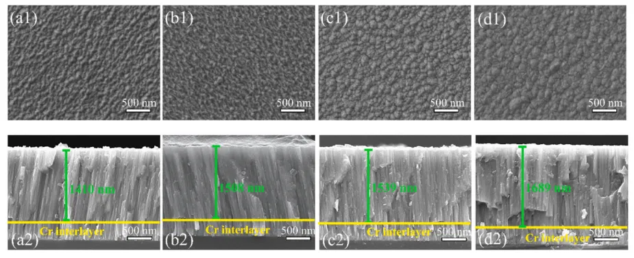 图2. 不同占空比沉积的CrN涂层的FESEM图像:表面形貌(a1-d1)和截面结构(a2-d2):(a)100%,(b)75%,(c)50%,(d)25%。
