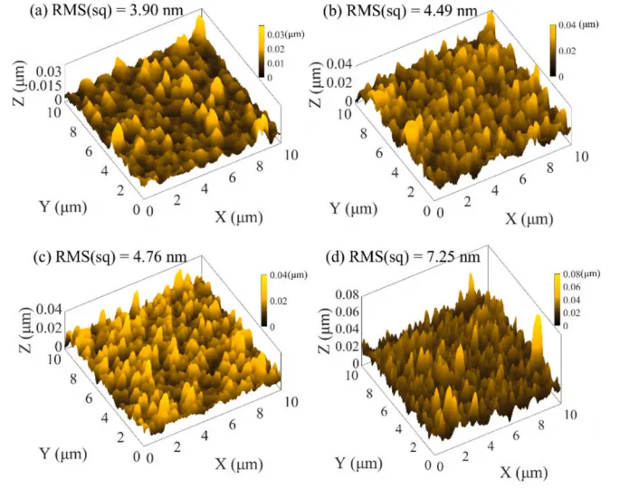 图3. 不同脉冲占空比沉积的CrN涂层的3D AFM图像及相应的RMS粗糙度(Sq)值:(a)100%,(b)75%,(c)50%,(d)25%。