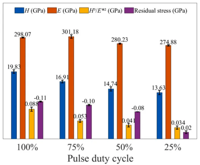 图4. 不同占空比沉积的CrN涂层的硬度、弹性模量、H³/E*²比率和残余应力。