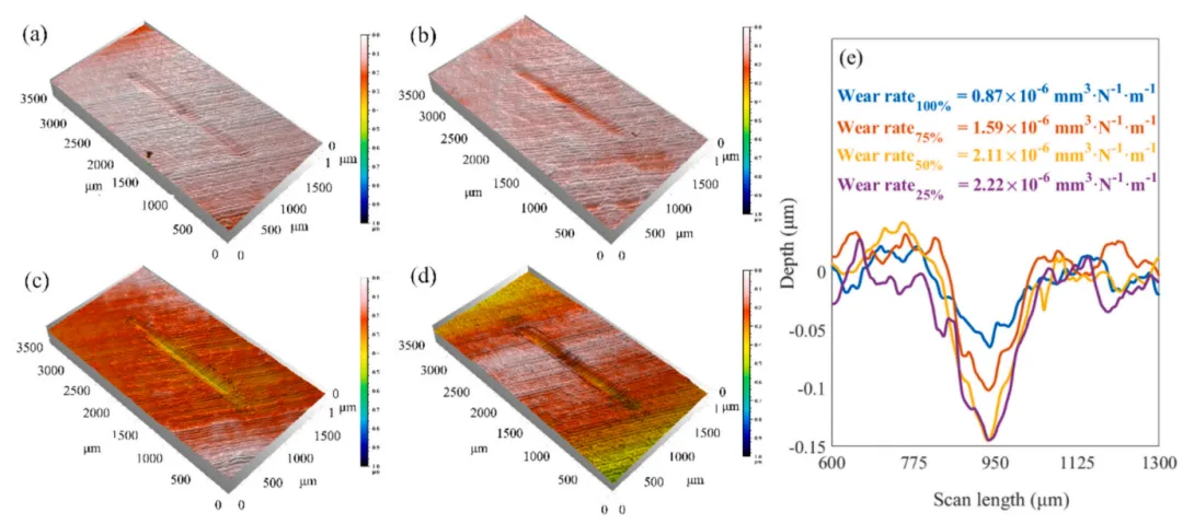 图5. 不同占空比沉积的CrN涂层摩擦学测试后的3D磨损轨迹形貌:(a)100%,(b)75%,(c)50%,(d)25%,以及(e)相应的残余深度轮廓。