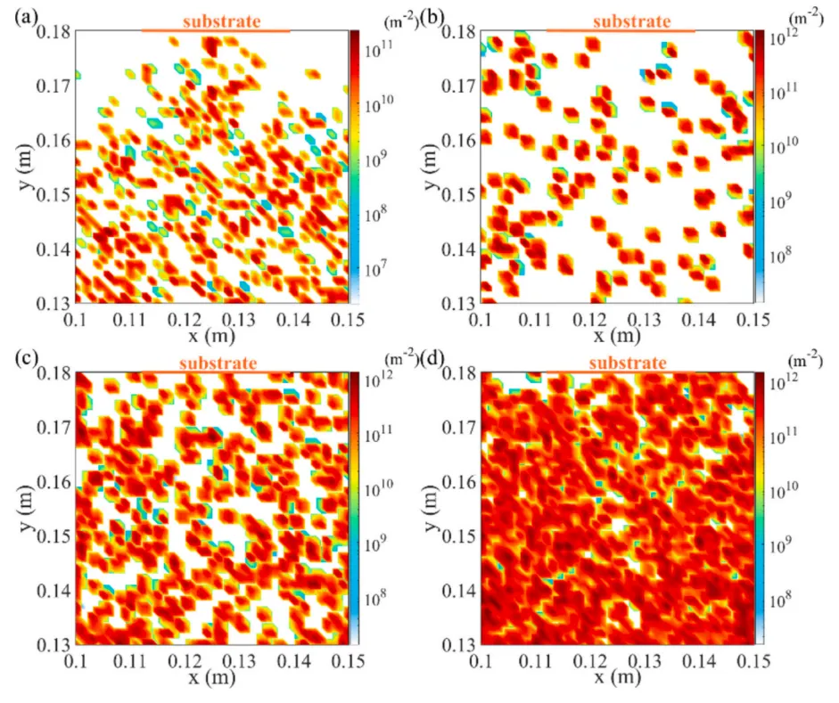 图6. 不同占空比下,脉冲开启阶段前瞬间衬底附近0.05 × 0.05 m²区域内Ar离子密度的空间分布:(a)100%,(b)75%,(c)50%,(d)25%。