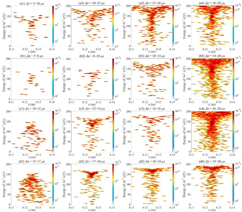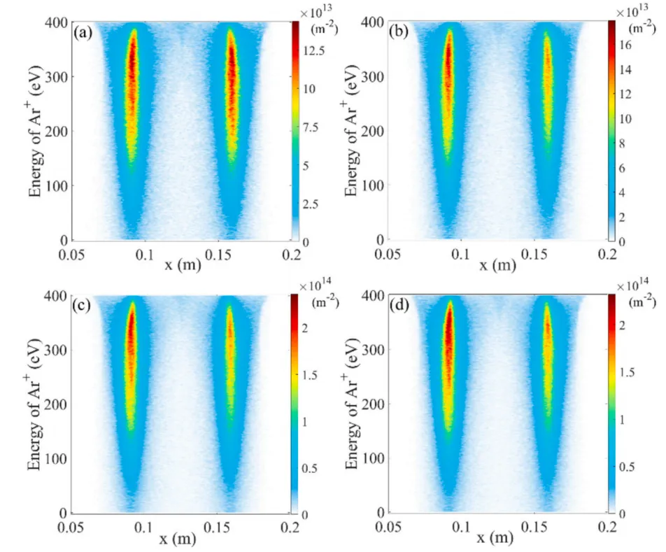 图7. 不同衬底偏压占空比下,单个脉冲周期内入射到靶材上的Ar离子能量分布函数(IEDF):(a)100%,(b)75%,(c)50%,(d)25%。