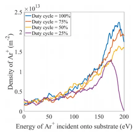 图9. 不同衬底偏压占空比下,单个脉冲周期内入射到衬底上的Ar离子的能量和密度分布。