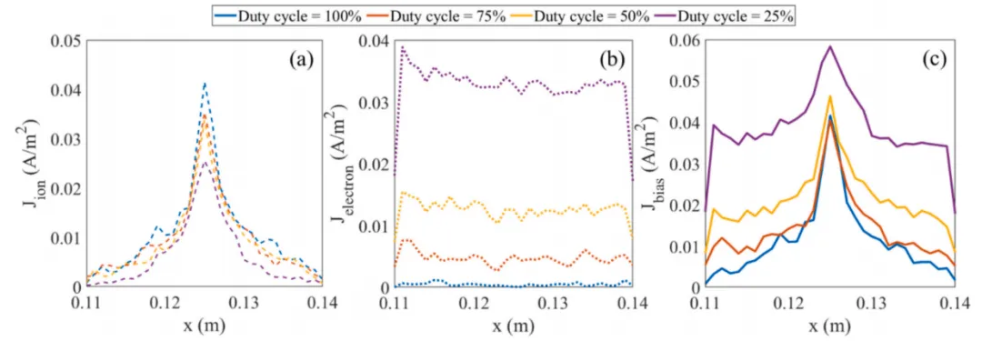 图10. 不同衬底偏压占空比下模拟的衬底电流密度贡献来自(a)离子,(b)电子, 以及(c)离子和电子的组合。