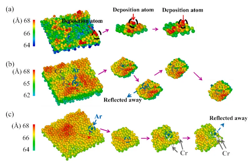 图12. MD模拟的原子快照显示CrN沉积(a)无Ar⁺轰击和(b, c)有150 eV Ar⁺轰击。包含选定的放大区域以显示局部原子构型。