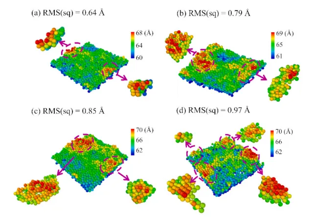 图13. 从MD模拟粒子坐标获得的CrN涂层表面形貌,以及不同衬底偏压占空比下相应的表面粗糙度和局部岛状生长结构:(a)100%,(b)75%,(c)50%,(d)25%。