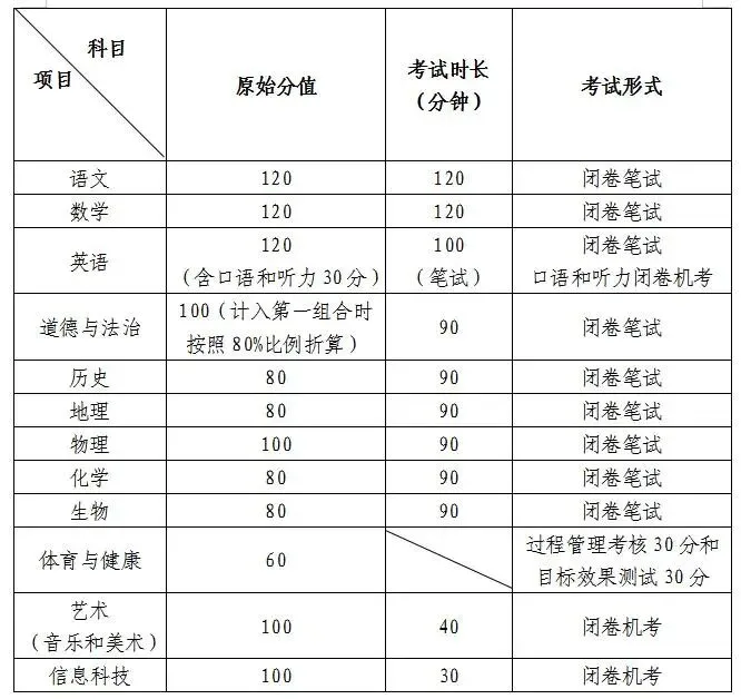 语文、数学、英语(含口语和听力)科目成绩以分数形式呈现,其他科目或科目组合成绩以等级形式呈现。其中,道德与法治、历史、物理、化学、体育与健康科目作为第一组合,总分400分;地理、生物科目作为第二组合,总分160分。两个组合均划分为A、B、C、D四个等级,等级划分标准为:以普通高中招生区域为单位,将参加考试学生总分从高到低排序,根据参加考试学生人数划分占比确定等级,A等占15%、B等占30%、C等占30%、D等占25%。