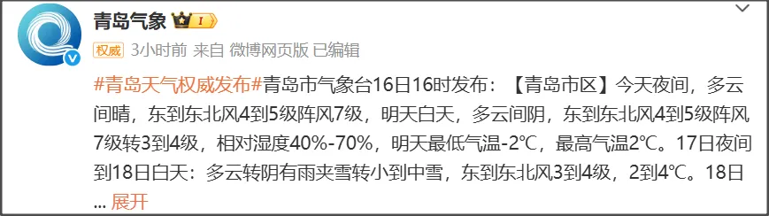 随着新一轮冷空气的赶到,气温开始进一步下降,18日夜间起气温持续下降,全市过程平均降温幅度10~12℃,最低气温出现在22日早晨,最低气温沿海地区-10℃左右,北部内陆地区-13℃~-10℃(图2和图3),23日起气温缓慢回升。18日夜间到20日,我市北风陆地可达4~5级阵风7~8级,近海海域7~8级阵风9级。18日傍晚到夜间,市区及南部沿海地区气温下降较快,可能会导致路面出现快速结冰并覆盖积雪的情况,对我市交通运输、城市运行有较大不利影响;新一股冷空气到访,17日天空云量增多,全市最高气温会降到1~3℃,午后风力逐渐减弱。需注意18日(本周日)凌晨开始到下周一,我市将会出现雨雪天气过程,其中,中北部地区全程都是降雪的形态,南部地区会由短暂雨夹雪转为纯雪;降雪主要集中在18日(本周日)夜间,19日白天到夜间仍有阵雪。【青岛市区】17日白天,多云间阴,东到东北风4到5级阵风7级转3到4级,相对湿度40%~70%,17日最低气温-2℃,最高气温2℃。17日夜间到18日白天:多云转阴有雨夹雪转小到中雪,东到东北风3到4级,2到4℃。18日夜间到19日白天:阴有中雪,北风4到5级阵风7到8级,-5到2℃。【预报各区】16日夜间到17日白天,多云间阴,东到东北风,海上6到7级阵风9级转5到6级阵风8级,内陆4到5级阵风7级转3到4级,17日最低气温-6℃,最高气温3℃。17日夜间到18日白天:多云转阴有雨夹雪转小到中雪,中北部地区小到中雪,东到东北风3到4级。18日夜间到19日白天:阴有中雪,中北部地区小到中雪,北风4到5级阵风7到8级。综合自中国天气、@青岛气象、@应急管理部等